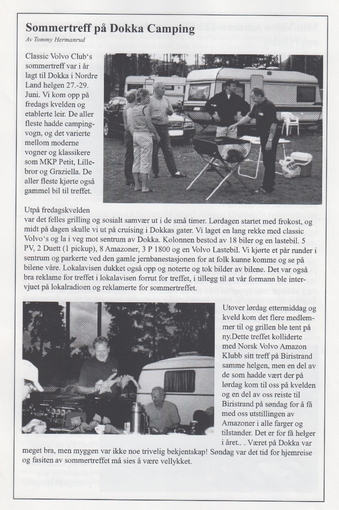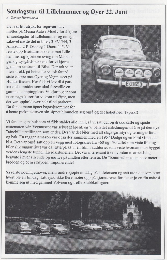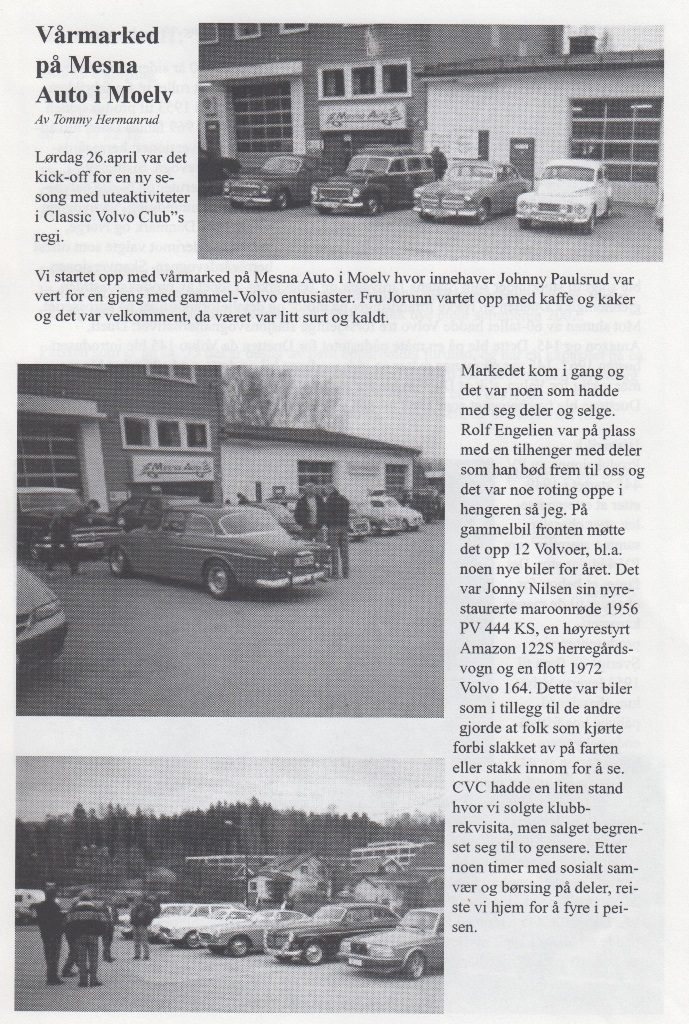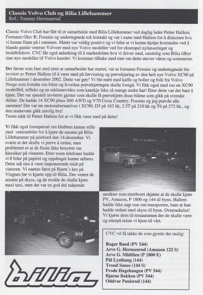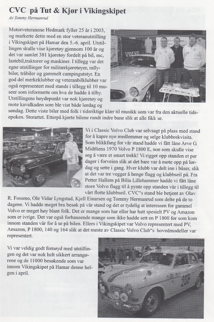 Da nærmer sesongen 2003 seg faretruende mot slutten. De fleste har vel parkert bilene sine for vinteren, men noen holder vel hjulene i gang også i vinter! Vi har i år, som årene før, hatt en fabelaktig sesong med mange jern i ilden og med mye grombil kjøring. Mange nye medlemmer har det også blitt!Vi startet i år med aktiviteter fra mars måned. Da hadde vi Aspic Show på Brumunddal veikro med stormende oppmøte!I april var vi med på Tut & Kjør utstillingen i Vikingskipet, og så hadde vi det tradisjonelle vårmarkedet på Mesna Auto i Moelv.På møtet i mai gjentok vi suksessen fra i fjor med å lage smøretreff på klubblokalet.Før ferien hadde vi på junimøtet vårt årlige grilltreff med GT Sara som hedersgjest, noe som falt alle våre medlemmer i smak!Sommertreffet vårt i juli var på Dokka Camping med stort oppmøte!I høst hadde vi vårt årlige høst marked på Mesna Auto som du kan lese om lengre bak i bladet.Ellers i sommer har vi jo selvfølgelig hatt våre månedelige søndags turer samt mange fine turer på medlemsmøtene. Jeg må rette en stor takk til arrangement komiteen for mange fine opplagte turer!Det som gjenstår i år er CVC sitt julebord som i år er lagt til VERTSHUSET PÅ BIRI. Der blir det servert juletallerken med ”någgå attåt”! Mer om det i bladet.Jeg vil også minne om årsmøtet vårt som er første onsdagen i Februar. Mange er på valg, så tips og ønsker sendes til valg komiteen. Jeg vil også takke alle medlemmene for fabelaktig frammøte på arrangementer, turer, treff og ellers tilstellninger gjennom Classic Volvo Club! Da gjenstår det bare for meg å takke for nok et fantastisk år med Classic Volvo Club og ønske alle velkommen på julebord fredag 5. desember.